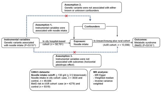 Experimental flow and assumptions for a two-sample Mendelian randomization (MR) of the causal association of daily total noodle intake with the risk of metabolic syndrome and its components.