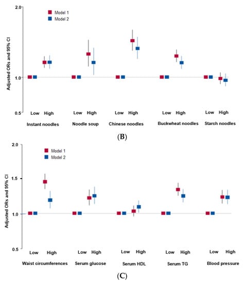 After adjusting for two different sets of covariates, the total intake of noodles was positively associated with MetS risk in a dose-dependent manner (Figure 2A). The 130 g/day total noodle intake showed the highest adjusted ORs for MetS risk, and it was used as the cutoff. The association of each type of noodle with MetS is presented in Figure 2B, where the cutoff of 25 g, 55 g, 40 g, 9 g, and 0.8 g per day was assigned for instant noodles, noodle soup, Chinese noodles, buckwheat noodles, and starch noodles, respectively. Among the types of noodles, the intake of instant noodles, noodle soup, Chinese noodles, and buckwheat noodles was associated with MetS, but the intake of starch noodles was not. Participants with high total noodle intake (≥130 g/day) had a higher risk of MetS and its components compared with those with low-noodle intake in both genders after adjusting for the covariates related to MetS (Table 3).