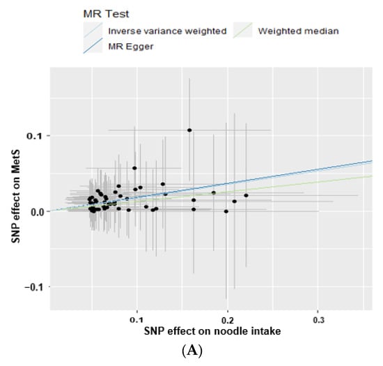 Among the MetS components, the intake of noodles showed a positive association with hypertension and dyslipidemia only in the logistic regression analysis in the IVW method (p = 0.005 and p = 0.006, respectively; Table 3). In linear association, noodle intake was positively associated with serum triglycerides, LDL, hypo-HDL, and glucose concentrations only in the IVW method (p = 0.01, 0.02, 0.02, and 0.004, respectively) but not in the MR-Egger, weighted median, and weighted mode methods (p > 0.05; Table 3 and Figure 3A). Furthermore, body composition, BMI, waist circumferences, and fat mass exhibited a positive relationship with noodle intake only in the IVW method (p = 0.004, 0.01, and 0.01, respectively, Table 3). However, serum glucose concentrations, BMI, and waist circumferences were close to statistical significance in the weighted median method (p = 0.086, 0.064, 0.066, respectively). Since the weighted median estimator retained greater precision than the MR-Egger analysis, serum glucose concentrations, BMI, and waist circumferences were causally positively associated with noodle intake.