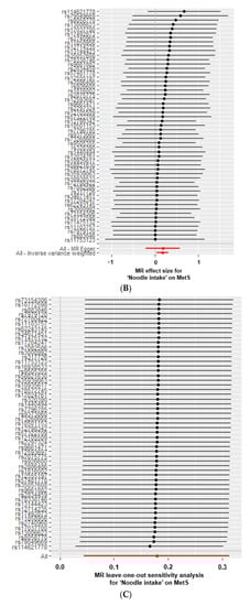 No heterogeneity was observed between noodle intake and MetS and its components in the MR-Egger and IVW analysis (p = 1; Table 3 and Figure 3B). The intercept of the association between noodle intake and the risk of MetS and its components was not significantly different from zero in the MR-Egger and IVW tests, demonstrating no significant horizontal pleiotropy of the association between them (p > 0.05; Table 3). Cochran’s Q test further indicated no heterogeneities in MetS and its components (all p-values of Cochran’s Q = 1). The exclusion of individual genetic variants in the leave-one-out analysis did not affect the association between total noodle intake and MetS and its components without removing one genetic variant by one (Figure 3C). Moreover, the lines for IVW and MR-Egger in the funnel plot for MetS were closely placed together. The distribution of genetic variants was close to symmetrical in the IVW and MR-Egger tests (Figure 3D). It indicates that the association between noodle intake and MetS did not manifest any signs of bias of the instrumental variables in the IVW and MR-Egger methods. The MR estimate of each SNP was plotted as a function of its MAF-corrected association with MetS. A MAF correction was used in proportion to the standard error of the SNP-MetS since a low MAF is likely to be measured with low accuracy. The plot revealed symmetry in the IVW and asymmetry in the MR-Egger method. Thus, noodle intake was causally and positively associated with MetS in the IVW method.