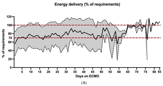 Additionally, energy requirements were calculated by simple weight-based equations and the adequacy of energy delivery was defined according to ESPEN guidelines [30], as indirect calorimetry cannot be used during ECMO support. Therefore, it is possible that energy targets have been over- or underestimated in our study. Although there are two proposed protocols for measuring energy expenditure during ECMO support, these protocols are still experimental and have not been evaluated for routine clinical use [48,49].