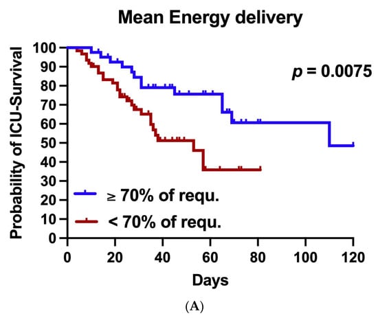 In order to evaluate the effects of medical nutrition therapy on ICU survival, we divided our patient population into two groups according to the adequacy of energy supply (mean calorie delivery ≥70% and <70% of calculated requirements over the course of ECMO therapy). Differences in the basic characteristics and nutrition support practices between these groups are depicted in Supplementary Tables S3 and S4. Patients with a mean calorie delivery ≥70% of the calculated requirements received more calories and protein. They had a significantly longer ECMO runtime (26 vs. 14 days; p < 0.0001) and a longer ICU LOS (51 vs. 27 days; p < 0.0001). As assessed by Kaplan–Meier survival estimation and the log rank test, a mean calorie delivery of ≥70% of calculated targets was associated with significantly lower ICU mortality (Figure 3A).