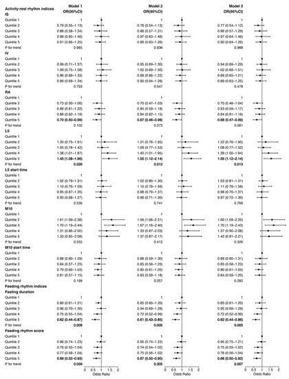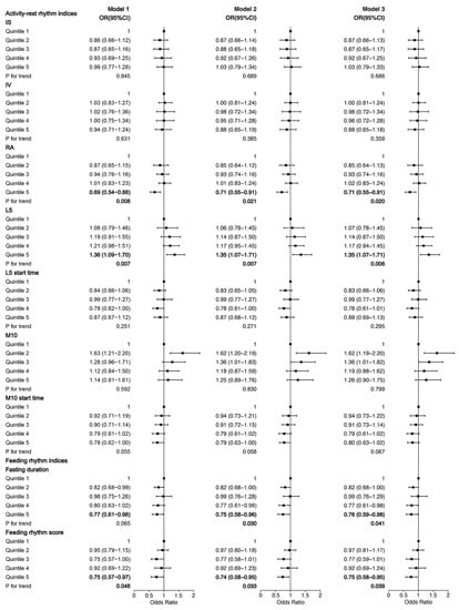 In order to examine whether the association of 24 h behavior rhythm indices with NAFLD is more obvious in those with higher BMI, we performed the same analyses among participants with obesity (defined as BMI ≥ 30) and the results are shown in Figure 2. The ORs of RA were similar to those in participants with overweight/obesity; while participants in quintile 5 of L5 had significantly higher ORs for NAFLD among participants with obesity compared with those in participants overweight/obesity. In Model 1, when adjusted for age, gender and race, participants in quintile 5 of L5 had an OR of 1.45 (95% CI, 1.08–1.96) among participants with obesity. When further adjusted for other demographic, lifestyle habits and disease confounders, participants in quintile 5 of L5 were still associated with a higher risk of NAFLD in Model 2 and Model 3 among participants with obesity (ORModel2 = 1.55, 95% CI, 1.12–2.14, ORModel3 = 1.55, 95% CI, 1.12–2.14). Additionally, the associations between feeding–fasting rhythm and NAFLD were also stronger among participants with obesity than those in participants with overweight/obesity. In Model 1, when adjusted for age, gender and race, participants in quintile 5 of fasting duration and feeding rhythm score had an OR of 0.62 (95% CI, 0.44–0.87) and 0.69 (95% CI, 0.52–0.93) for NAFLD, respectively. When adjusted for other confounders, participants in quintile 5 of fasting duration and feeding rhythm score were still associated with a lower risk of NAFLD among participants with obesity (ORModel2 = 0.61, 95% CI, 0.43–0.85 for fasting duration, ORModel2 = 0.67, 95% CI, 0.50–0.90 for feeding rhythm score); (ORModel3 = 0.62, 95% CI, 0.44–0.86 for fasting duration, ORModel3 = 0.68, 95% CI, 0.50–0.92 for feeding rhythm score).