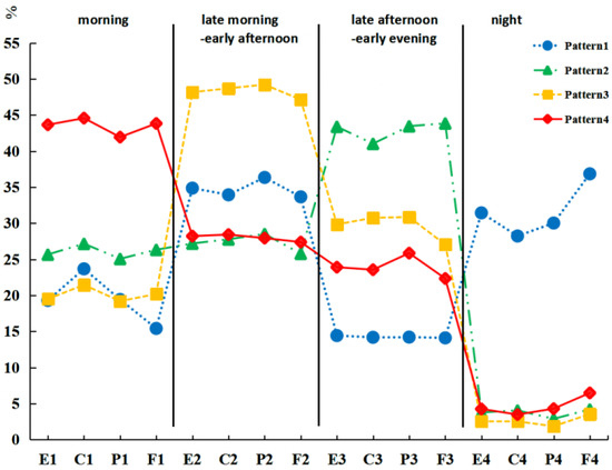 The four latent dietary profiles were characterized by average energy and macronutrient distribution in different time windows. Complete data of dietary recalls and sleep/wake time, 6.8% (n = 16, N = 234) were classified as having pattern 1, “high night distribution”. This group had a relatively high average energy and macronutrient distribution in the night time window. A total of 40.6% (n = 95, N = 234) were classified as having pattern 2, “high late afternoon–early evening distribution”. This group had relatively high average energy and macronutrient distribution in the late afternoon–early evening time window. Further, 31.2% (n = 73, N = 234) were classified as having pattern 3, “high late morning–early afternoon distribution,” who had relatively high average energy and macronutrient distribution in the late morning–early afternoon time window, and 21.4% (n = 50, N = 234) were classified as having pattern 4, “high morning distribution,” who had relatively high average energy and macronutrient distribution in the morning time window (shown in Figure 1).
