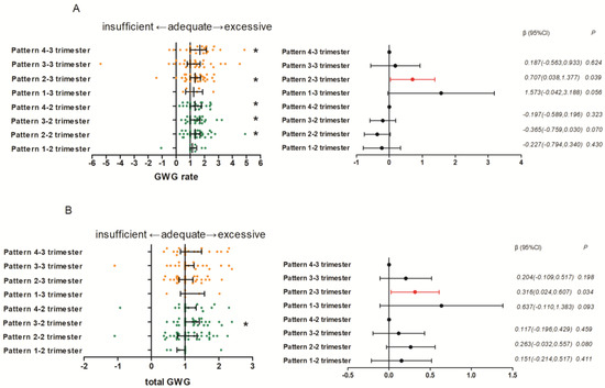 The effect of dietary patterns on GWG One Sample Wilcoxon Signed Rank Tests; Multiple Linear Regression Models (method = backward): (A) the effect of dietary patterns in the second and third trimesters on the adequacy of GWG rate; (B) the effect of dietary patterns in the second and third trimesters on the adequacy of total GWG * Values were significantly different from 1.