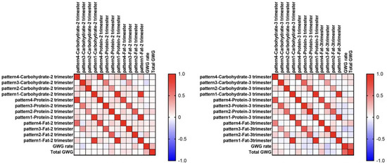 The Sample Wilcoxon Signed Rank Test was used to evaluate the adequacy of GWG in pregnant women with different dietary patterns. Spearman’s correlation was used to explore correlations among macronutrient intake in different time windows and the GWG. Multiple Linear Regression Models (method = backward) were used to determine the effects of dietary patterns (independent variables) and macronutrient intake in different time windows (independent variables) on the adequacy of weight gain (dependent variable). Models were adjusted for age, educational level, employment status, household income, pregestational BMI, parity, the condition of gestational diabetes mellitus, gender of offspring, physical activity, daily sleep duration, time node of the time window, number of eating episodes, total energy intake, and gestational week of delivery. p < 0.05 was considered statistically significant. Statistical analyses were performed using SPSS version 24 and Mplus version 6.0.