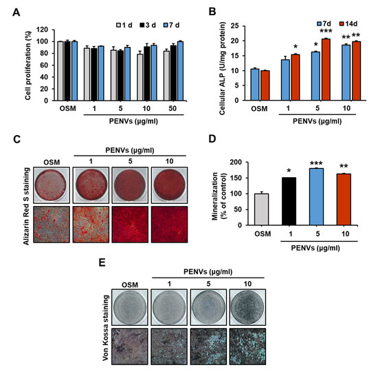 PENVs modulate osteoblast activation and differentiation. (A) Proliferation of MC3T3-E1 cells is shown using MTT assay. (B) Cellular ALP activity in osteoblastic MC3T3-E1 cells treated with PENVs. (C) Representative images of Alizarin Red S staining of MC3T3-E1 cells after treatment with PENVs for 7 days are shown. (D) Ca deposit in extracellular matrix was quantified using Alizarin Red S dye. (E) Representative images of von Kossa staining after treatment of MC3T3-E1 cells with PENVs for 7 days. * p < 0.05, ** p < 0.01, *** p < 0.001 between PENVs and control group (OSM; osteogenic medium).