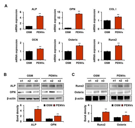 PENVs promote the expression of mRNA and protein of osteoblast differentiation markers. (A) mRNA expression of osteoblast markers was determined by real-time qPCR. (B) Levels of alkaline phosphate (ALP) and osteopontin (OPN) were determined using Western blot analysis. (C) Expressions of Osterix and Runx2 as osteoblast differentiation transcription factors in osteoblastic MC3T3-E1 cells are shown. Data are presented as means ± SD (n = 3). ** p < 0.01 between PENVs and control group (OSM; osteogenic medium).