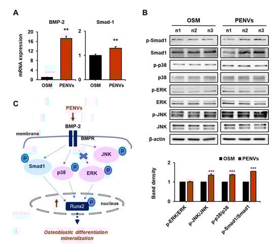Bone morphogenetic protein-2 (BMP-2) is a key signaling target molecule in osteoblast differentiation and formation [25,26]. BMP-2 is an upstream regulator of the Runx2, an osteoblast differentiation transcription factor. Additionally, BMP-2 modulates the activation of the major mitogen-activated protein kinase (MAPK) molecules (p38, JNK, and ERK) and Smad-1 activation. To determine whether PENVs promote BMP-2 signaling, we performed RT qPCR to determine the mRNA levels of BMP-2 and Smad-1, followed by Western blot analysis to confirm the expression of phospho-Smad1, -p38, -ERK and -JNK. The gene expression levels of BMP-2 and Smad-1 were enhanced in PENV-treated osteoblastic MC3T3-E1 cells (Figure 4A). In addition, PENVs markedly increased the phosphorylation of JNK, p38, and Smad1 in MC3T3-E1 cells (Figure 4B). However, the PENVs did not modulate the phosphorylation of the ERK protein. These results suggest that PENVs enhance osteoblast differentiation genes and proteins through the BMP-2/MAPK/Smad-1 dependent Runx2 pathway (Figure 4C).