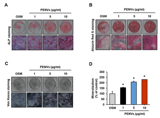 PENVs enhance differentiation of mouse primary osteoblasts. (A–C) Representative images of ALP staining, Alizarin Red S staining, and von Kossa staining are shown. (D) Ca deposition in extracellular matrix was quantified using Alizarin Red S dye. Data presented as the means ± SD (n = 3). * p < 0.05 between PENVs and control group (OSM; osteogenic medium).