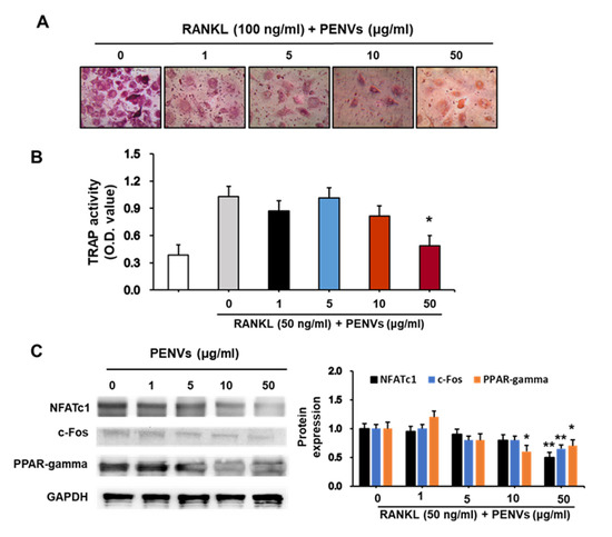 Osteoclasts play a major role in maintaining bone remodeling [38]. However, an increase in osteoclasts or their hyperactivation may cause an imbalance in bone homeostasis, thereby contributing to the development of bone-related diseases, such as osteoporosis, bone fracture, and bone loss. In the present study, PENVs suppressed RANKL-dependent osteoclast formation and differentiation without having any cytotoxic effects. Treatment with PENVs prior to RANKL treatment significantly inhibited RANKL-induced formation of TRAP-positive cells (Figure 6A). In addition, TRAP activity and osteoclast activation of PPAR-gamma, NFATc1 and c-Fos proteins were inhibited by treatment only with 50 µM of PENVs (Figure 6). Thus, PENV treatment significantly inhibited RANKL-induced osteoclast differentiation.