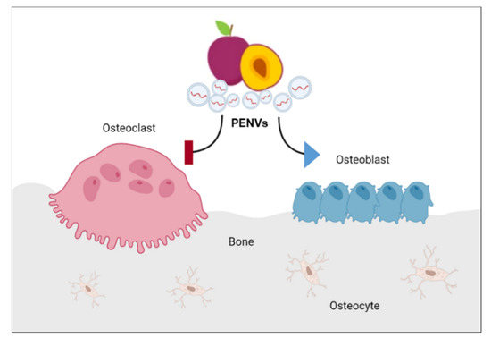 In the current study, we first isolated and characterized exosomes, such as nanovesicles, extracted from fresh plum juice. We found that PENVs exhibited biological functions in the regulation of osteoblasts and osteoclasts activation (Figure 7). Treatment with PENVs enhanced osteoblast activation in osteoblastic MC3T3-E1 cells and primary osteoblasts in mice. In addition, PENVs increased the mRNAs and protein expression of osteoblast differentiation markers, such as ALP and OPN, and transcription factors, such as Osterix and Runx2. In particular, activation of the BMP-2/MAPK/Samd-1 dependent Runx2 pathway was induced by treatment with PENVs, suggesting that PENVs promote osteoblast differentiation through BMP-2/MAPK/Samd-1 molecules. In addition, PENVs treatment inhibited osteoclastogenesis in primary mouse osteoclasts. Therefore, these results imply that PENVs could be used for the optimal treatment of osteoporosis.