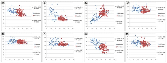 For the whole group, the analysis of the distribution of measured initial and final values for the investigated parameters and vitamin D levels (Pearson correlation) indicated significant negative linear correlations with AP (p < 0.001), TG (p < 0.001), glycemia (p = 0.017), SBP (p < 0.001), DBP (p = 0.001), ALT (p < 0.001) and BMI (p < 0.001) and significant positive linear correlations with HDLch (p < 0.001) for the initial status (Figure 1A–H). For the final status, we recorded significant negative linear correlations with AP (p = 0.003) and ALT (p = 0.033); a correlation at the limit of significance with BMI (p = 0.066); non-significant negative correlations with TG (p= 0.191), glycemia (p = 0.517), SBP (p = 0.260) and DBP (p = 0.354); and a non-significant positive correlation with HDLch (p = 0.556) (Figure 1A–H). The intersection of the initial and final trends had the significance of the presence of an effect of vitamin D status on the measured values of the analyzed parameters. It should be noted that if the initial and final measured values of vitamin D were compared combined with those of the investigated parameters, all the correlations were statistically significant (p < 0.001, Pearson testing), keeping the trends of the separate evaluations, which we consider to have brought additional information.