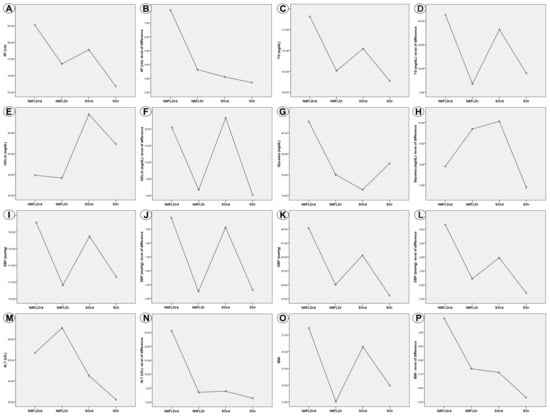 The level of the final measured mean values and the level of difference mean values for AP (A,B), TG (C,D), HDLch (E,F), glycemia (G,H), SBP (I,J), DBP (K,L), ALT (M,N) and BMI (O,P).