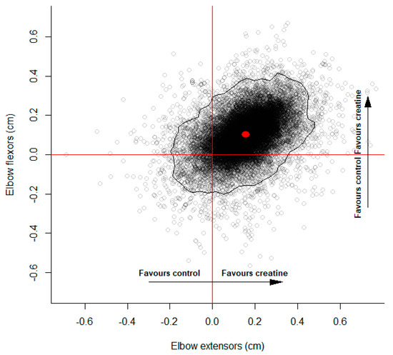 Multivariate controlled mean difference posterior estimates for elbow flexors and extensors. Points represent multivariate mean difference posterior estimates. Positive values favor creatine supplementation and negative values favor control. Red dot illustrates median values for the marginal mean difference posterior estimates. Black curve represents the 95% highest posterior density region.