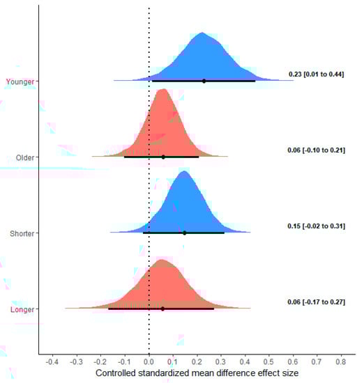 The potential moderating effects of age and the duration of the intervention were investigated using controlled standardized mean differences across all the outcomes. Six studies comprising 26 outcomes were conducted with older adults (mean age: 61.6 years) and four studies comprising 18 outcomes were conducted with younger participants (mean age: 23.5 years). Evidence was obtained that the controlled standardized mean differences were greater for younger participants ( −0.17 (95%CrI: −0.45 to 0.09); P(Younger > Older) = 0.910; Figure 6).