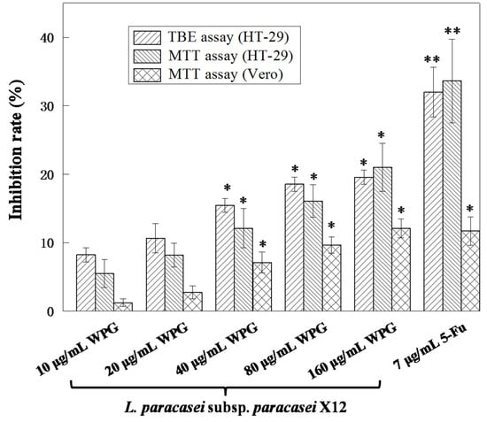 HT-29 and Vero cells were exposed to varying concentrations of WPG for 48 h. Inhibitory effects upon cell proliferation were determined via MTT and TBE assays. All values are presented as the mean ± standard deviation (SD) of three replications. Asterisks indicate samples that are significantly different from the control (* p < 0.05, ** p < 0.01).