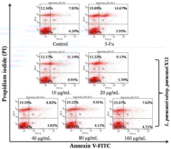 Measurements of apoptosis and necrosis were performed as described by Sambrani et al. (2019) [29]. After incubation, the cells were washed with ice-cold phosphate-buffered saline (PBS, pH 7.2) and stained with 5 μL of Annexin V-FITC and 5 μL of propidium iodide (PI) at room temperature (25 °C) in the dark for 15 min. The cells were then analyzed by flow cytometry (FACS Calibur, Franklin Lake, NJ, USA) and the data were further analyzed by Cell Quest software. HT-29 cells that stained positive for Annexin VFITC and negative for PI were undergoing apoptosis. The cells that stained positive for both Annexin V-FITC and PI were either in the late stage of apoptosis or necrosis. The cells that stained negative for both Annexin V-FITC and PI were not undergoing apoptosis.