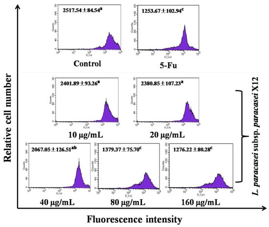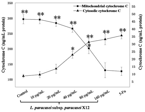 Sarkar et al. [17] revealed that probiotic action of bifidobacteria was mediated by surface-associated structures such as exopolysaccharides or lipoteichoic acids. Accordingly, the anticarcinogenic activity of living L. paracasei subsp. paracasei X12 might be attributed to cell wall peptidoglycan. Previous studies have shown that existing anticancer therapies mostly focus on inducing apoptosis in cancer cells [18]. Apoptosis is induced by extracellular (extrinsic pathway, death-receptor-mediated) or intracellular (intrinsic pathway, mitochondria-mediated) signals [19]. The intrinsic pathway is a principal apoptotic pathway, elicited by mitochondria-mediated processes and induction of the caspase signaling cascade activation [20]. In turn, mitochondrial membrane potential (Ψm) dysfunction leads to the release of the proapoptotic molecule and cytochrome C (Cyto-C) from mitochondrial to the cytosolic spaces with the accumulation of reactive oxygen species (ROS) [21,22]. The release of Cyto-C and resultant over-production of ROS initiates (triggers) a caspase cascade, which is also regulated by the Bcl-2 family of proteins.