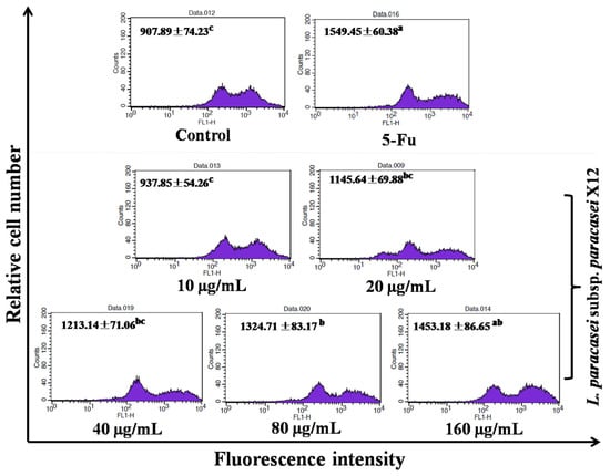 HT-29 cells treated with WPG for 48 h stained with DCFH-DA, followed by analysis using flow cytometry. All values are presented as the mean ± standard deviation (SD) of three replications. (a–c) symbols indicate samples that are significantly different from the control (p˂ 0.05).