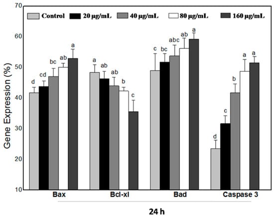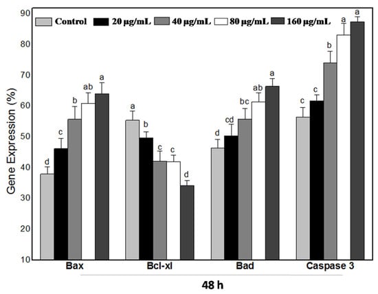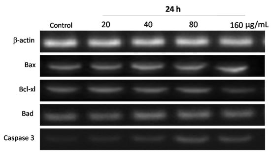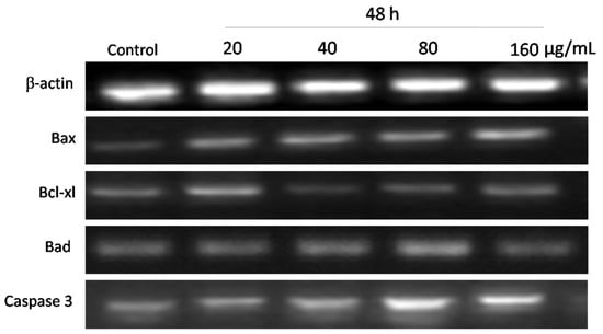 Furthermore, when cells were treated with 20, 40, 80, and 160 µg mL−1 of WPG for 48 h, we observed the increase by 21.64%, 46.78%, 60.31%, and 68.60% in mRNA expression levels in Bax and the increase by 8.70%, 20.47%, 32.36%, and 43.24% in Bad and the decrease by 10.30%, 23.83%, 24.25%, and 38.14% in Bcl-xl, respectively, compared with the negative control (Figure 10 and Figure 11).