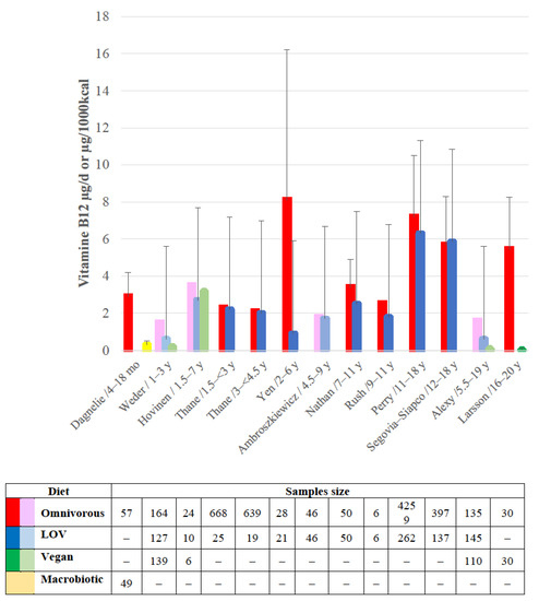 Bar chart to present the reported vitamin B12 intake in lacto-ovo-vegetarian (LOV), vegan or macrobiotic children compared to omnivorous counterparts [35,36,39,40,41,43,46,47,48,49,74,75]. The dark-colored bars display the mean with SD, when available, whereas the light-colored bars display the median value.