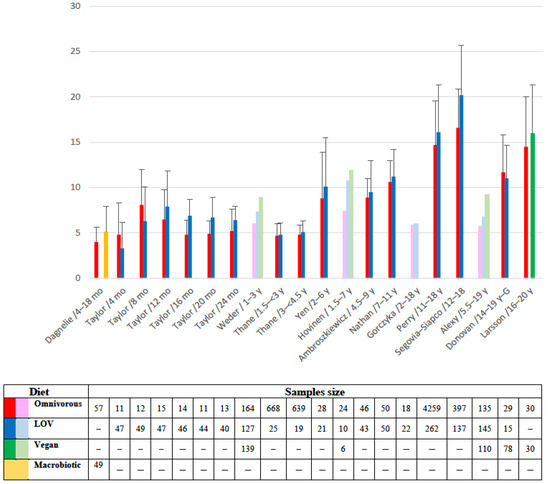 Many of the reported studies are relatively old, with 53% of them conducted more than 25 years ago [35,36,37,38,39,40,41,77,95], and only a third less than 10 years ago [45,46,47,48,49,74,78]. All are observational studies, frequently enrolling a quite small number of children based on the voluntary participation of the parents. Parents who are likely to be concerned about their own health and that of their child and who are better able to practice a balanced diet and give supplements. The use of such supplements is rarely specified in the calculation of intake. Little information is provided about the duration of a vegetarian or a vegan diet in the various population groups, whereas there is inconsistency in the definition of vegetarianism, leading to a great heterogeneity in the vegetarian spectrum and a great dispersion in the results as shown in the figures. The heterogeneity of the results may also be linked to the use of different modes of assessment of intakes, which may use a food frequency questionnaire or a dietary record on one or three days. Moreover, most of the studies have been conducted in industrialized and high-income countries and neither socioeconomic status nor the environment was considered. Last but not least, very few studies have set the evidence of micronutrient shortfall by performing the appropriate tests in blood or urine samples and thus assessing the child’s micronutrient status.