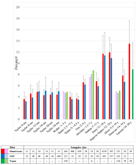 Bar chart to present the reported zinc intake in lacto-ovo-vegetarian (LOV)and vegan children compared to omnivorous counterparts [36,37,39,40,41,42,46,47,48,49,95]. The dark-colored bars display the mean with SD, when available, whereas the light-colored bars display the median value.