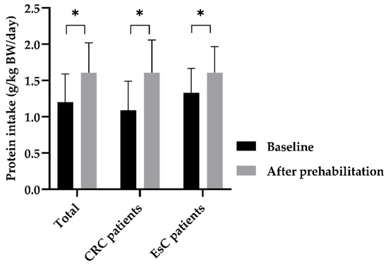 Daily protein intake corrected for body weight (BW) between baseline and after prehabilitation, presented for the total population (n = 64), CRC patients (n = 35), and EsC patients (n = 29). * p < 0.05.