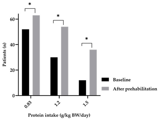 Number of patients achieving daily protein goals set to 0.83 g/kg BW, 1.2 g/kg BW, and 1.5 g/kg BW at baseline and after prehabilitation. * p < 0.05.