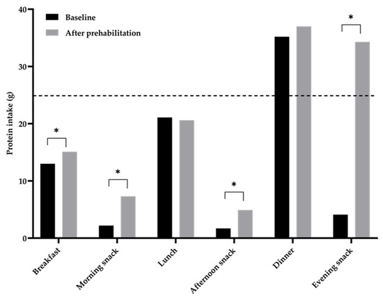 Median protein intake in grams (g) per meal for n = 54 patients at baseline and after prehabilitation. Threshold of 25 g protein visualized as dashed line. * p < 0.05.