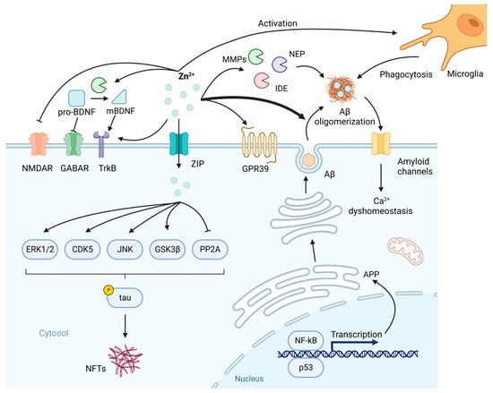 The involvement of Zn2+ in the pathogenesis of Alzheimer’s disease (AD). Zn2+-containing transcription factors NF-κB and p53 participate in the synthesis of amyloid precursor protein (APP) and subsequent β-amyloid (Aβ). After production, Aβ is secreted upon neuronal activity and aggregated by Zn2+. In normal conditions, Zn2+ inhibits N-methyl-d-aspartate receptor (NMDAR) to regulate synaptic neurotransmission. Also, Zn2+ is involved in the normal memory events such as long-term potentiation (LTP) by TrkB and GPR39. brain-derived neurotrophic factor (BDNF)-TrkB axis needs to be modulated by Zn2+ because Zn2+-dependent MMPs are indispensable to the transformation of pro-BDNF to mBDNF, while pro-BDNF inhibits GABAergic transmission. In addition, the clearance of Aβ is affected by Zn2+. Zn2+ metalloproteinases including matrix metalloproteinases (MMPs), neprilysin (NEP) and insulin-degrading enzyme (IDE) are involved in the degradation of Aβ, while Zn2+-loaded Aβ oligomers have increased resistance to proteolysis. Microglia can be activated by Zn2+ to enhance the phagocytosis of Aβ. Due to the sequestration of Zn2+ by Aβ, these normal neurobiological activities in which Zn2+ plays a crucial role are disrupted. Aβ can incorporate into membranes to form amyloid channels, as a result, an inward flow of Ca2+ is initiated, leading to Ca2+ dyshomeostasis. On the other hand, intracellular Zn2+ can lead to phosphorylation of tau by activating extracellular signal-regulated protein kinase 1/2 (ERK1/2), cyclin-dependent kinase 5 (CDK5), c-Jun N-terminal kinase (JNK), glycogen synthase kinase 3β (GSK3β) and inhibiting protein phosphatase 2A (PP2A). Created with BioRender.com. Adapted from “Drosophila Toll Pathway”, by BioRender.com (2023). Retrieved from https://app.biorender.com/biorender-templates (accessed on 9 February 2023).