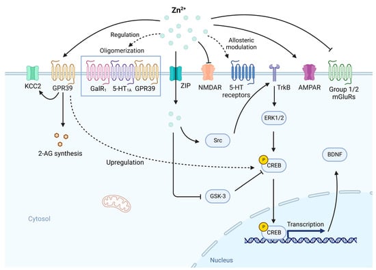 The involvement of Zn2+ deficiency in the abnormal neurotransmission and neurotropic signaling in depression. In normal conditions, the activities of glutamatergic receptors including NMDAR and α-amino-3-hydroxy-5-methyl-4-isoxazole propionic acid receptor (AMPAR) need to be regulated by Zn2+. The activation of GPR39 by Zn2+ is essential for endocannabinoid 2-arachidonoylglycerol (2-AG) synthesis and the upregulation of potassium chloride co-transporter 2 (KCC2). GPR39 activation can upregulate cAMP response element binding protein (CREB) expression, thus increase BDNF expression. Zn2+ is involved in the allosteric modulation of 5-HT receptors and regulation of the oligomerization state between GalR1-5-HTA1-GPR39. Zn2+ is also an antagonist of groupⅠand group Ⅱ mGluRs, which are linked to depression. While intracellular Zn2+ participates in the modulation of neurotropic signaling, which is crucial in depression. Zn2+ can transactivate TrkB and downstream ERK1/2 and CREB via Src family kinase, on the other hand, inhibit glycogen synthase kinase-3 (GSK-3), which inhibits CREB activity, leading to the expression of BDNF. Under Zn2+ deficiency, these activities associated with depression are disrupted, contributing to the development of depression. Created with BioRender.com. Adapted from “Drosophila Toll Pathway”, by BioRender.com (2023). Retrieved from https://app.biorender.com/biorender-templates (accessed on 17 February 2023).