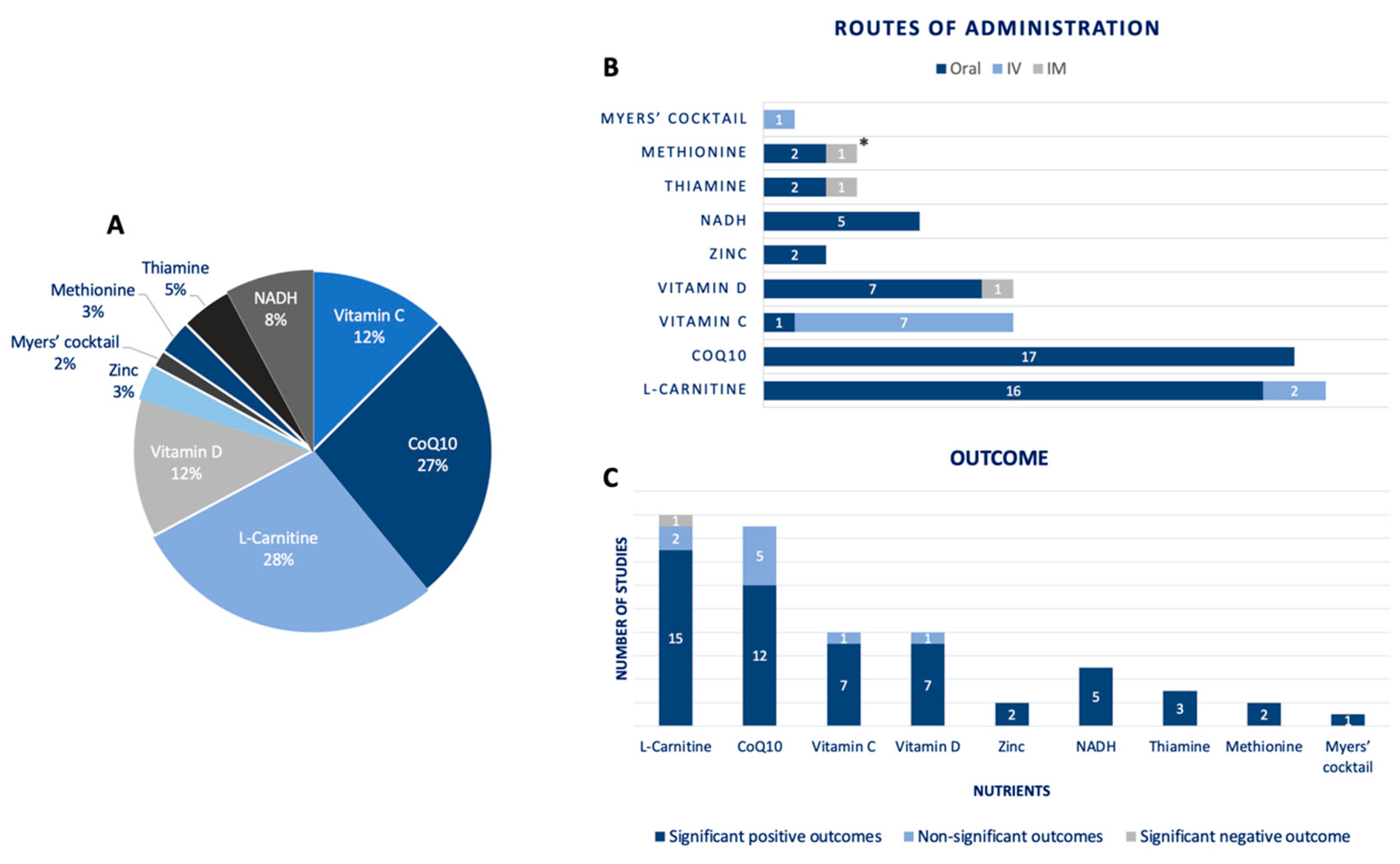 - Castro-Marrero, J.; Segundo, M.J.; Lacasa, M.; Martinez-Martinez, A.; Sentañes, R.S.; Alegre-Martin, J. Effect of Dietary Coenzyme Q10 Plus NADH Supplementation on Fatigue Perception and Health-Related Quality of Life in Individuals with Myalgic Encephalomyelitis/Chronic Fatigue Syndrome: A Prospective, Randomized, Double-Blind, Placebo-Controlled Trial. Nutrients 2021, 13, 2658. [Google Scholar] [CrossRef]