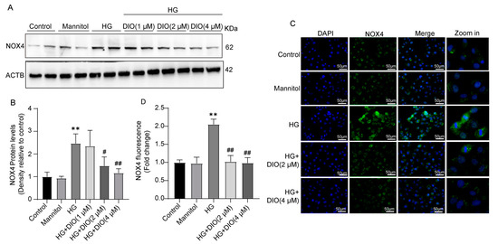DIO suppressed the expression of NOX4 in HK-2 cells. (A) The representative immunoblotting images of NOX4 and ACTB. (B) Quantitative analysis of NOX4 protein expression. (C) The representative immunofluorescence staining images of NOX4, ×400, scale bars = 50 µm. (D) Quantitative analysis of NOX4 immunofluorescence. Data in (A,B) (n = 2) and in (C,D) (n = 5) were presented as mean ± SD. ** p < 0.01 indicate versus control group; # p < 0.05 and ## p < 0.01 indicate versus HG group.