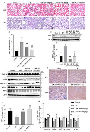 DIO restored MRC complex expressions and inhibited the expression of NOX4 in the rat kidney tissues. (A) The representative H&E and PAS staining images of rat kidneys, ×200, scale bars = 50 µm. (B) Quantitative analysis of PAS positive staining. (C) The representative immunoblotting image and quantitative analysis of NOX4 protein expression. (D) The representative immunoblotting images of MRC complexes I-V and ACTB. (E) The representative immunohistochemistry images of ATP8, ×200, scale bars = 40 µm. (F) Quantitative analysis of ATP8 immunohistochemistry. (G) Quantitative analyses of MRC complexes I–V protein expressions. Data were expressed as mean ± SD (n = 3). * p < 0.05 and ** p < 0.01 indicate versus control group; # p < 0.05 and ## p < 0.01 indicate versus HG group.
