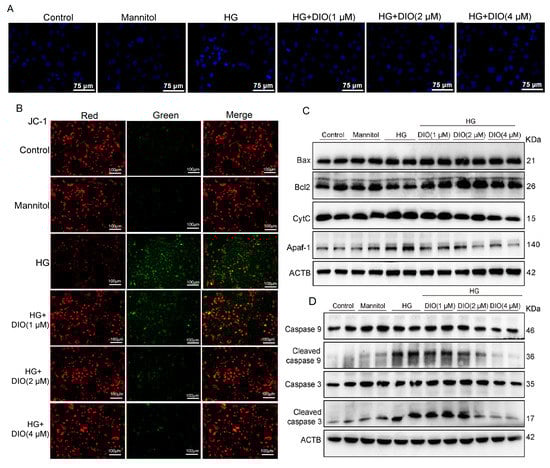 Oxidative stress can cause severe damage to mtDNA and then cause mitochondria-mediated cell apoptosis. DAPI is common staining to detect cell apoptosis. The DAPI staining showed that HG exposure caused HK-2 cell apoptosis (dense or fragmented dense hyperchromatic nucleus) and DIO relieved the cell apoptosis (Figure 5A). The decline of MtMP is a marker of early cell apoptosis and the JC-1 probe can indicate the changes in MtMP. In this study, the data of JC-1 staining showed that red/green fluorescence intensity decreased greatly, suggesting that the MtMP decreased greatly in HG-treated HK-2 cells, while, DIO co-treatment improved the MtMP significantly (Figure 5B). Moreover, treatment with HG in HK-2 cells resulted in the up-regulation of mitochondrial pro-apoptotic proteins (Apaf-1, CytC, cleaved caspase 3, and cleaved caspase 9) and the down-regulation of anti-apoptotic protein-Bcl2. Conversely, DIO treatment down-regulated the expressions of the above pro-apoptotic proteins, while up-regulated Bcl2 expression, an anti-apoptotic protein (Figure 5C,D, Figures S2 and S6). Therefore, we summarized that DIO relieved mitochondrial disorder and its-mediated cell apoptosis in HK-2 cells.