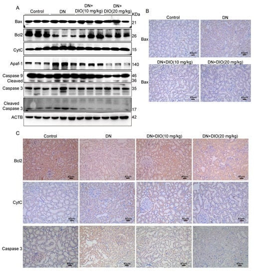 To further determine whether DIO ameliorates mitochondria-mediated cell apoptosis in vivo, the expressions of mitochondrial apoptotic proteins in rat kidney tissues were measured by Western blot and immunohistochemistry. Our results indicated that the up-regulation of mitochondrial pro-apoptotic proteins (Bax, CytC, Apaf-1, cleaved caspase 3, and cleaved caspase 9) were inhibited by DIO. While, the down-expression of Bcl2, an anti-apoptotic protein, was restored by DIO application (Figure 6, Figures S3, S6 and S7). Therefore, DIO protected against cell apoptosis by suppressing the mitochondrial apoptotic pathway in DN rats.