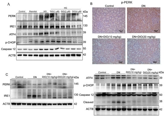 Oxidative stress can also induce ER stress and its-mediated cell apoptosis, which also contributes to the occurrence and development of DN. The ER stress associated apoptosis is regulated by transmembrane proteins (IRE1 and PERK) and their downstream proteins including CHOP, ATF4, and caspase 12. Thus, these protein expressions were detected by Western blot and immunohistochemistry in this study. As shown in Figure 7A and Figure S4, the expressions of ER stress-related proteins (IRE1, ATF4, PERK, p-CHOP, and Caspase 12) were up-regulated significantly in HK-2 cells treated with HG. DIO inhibited the up-regulation of these proteins. Consistent with the results obtained in vitro, the up-expressions of IRE1, p-PERK, ATF4, p-CHOP, and caspase 12 were relieved by DIO in vivo (Figure 7B,C and Figures S5–S7). Altogether, the above data showed that DIO suppressed cell apoptosis by inhibiting ER stress in HK-2 cells and DN rats.