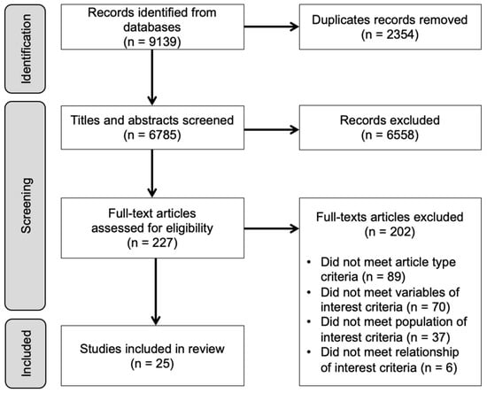The search yielded 9139 hits, which were imported into Covidence, an online systematic review management system, for screening. After removing duplicates, we were left with 6785 unique articles to screen. We screened the titles and abstracts to identify potential studies for inclusion; articles deemed irrelevant were not reviewed at the full-text level. All authors contributed to screening at each level. At each level, articles were independently screened by two individuals. Conflicts were resolved by a third reviewer.