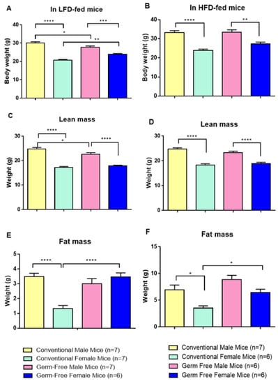 We and others have shown that estrogen protects female mice from HFD-induced obesity [28,29]. Estrogens exert protective effects by acting in the brain [30,31], liver [29], adipose tissue, and muscle [32] to regulate energy production and utilization. Consistent with a previous report [33], both CV and GF male mice had heavier body weight and lean mass than their corresponding female mice, regardless of whether they were on LFD or HFD. Interestingly, for the first time, we found that GF female mice were heavier than CV female mice (A,B), mainly due to significantly more fat mass (Figure 1E,F). These observations indicate that microbiota may uniquely affect fat mass composition in female mice compared with male mice.