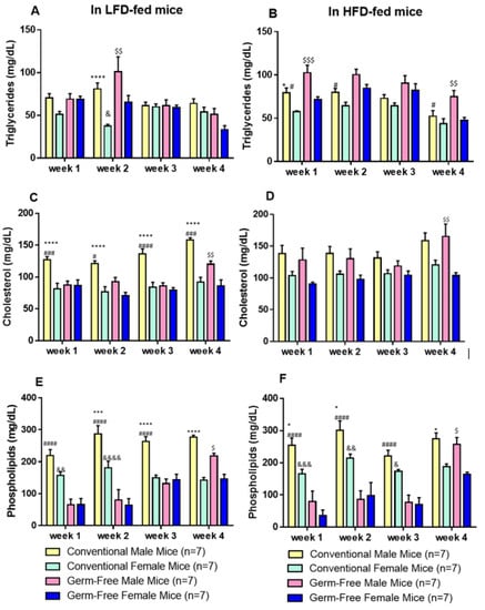 As shown in Figure 2E,F, after LFD or HFD feeding, both male and female CV mice had significantly higher phospholipid (PL) levels in the first two weeks. By Week 4 in both LFD and HFD groups, the PL levels in GF male mice increased, and the PL levels in both male CV and GF mice were significantly higher than those in their corresponding females (Figure 2E,F).