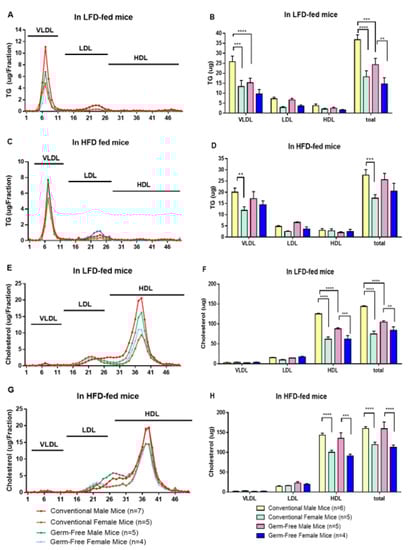 Unlike TG in VLDL fractions, CHOL levels were changed mainly in HDL fractions. In the LFD groups, the male CV and GF mice had significantly higher CHOL levels in HDL fractions and total CHOL levels than their corresponding female mice (Figure 3C,D). Additionally, the CV male mice had significantly higher CHOL levels in HDL fractions and total CHOL levels than GF male mice (Figure 3E,F). After 4-week HFD feeding, the levels of CHOL in HDL fractions in male GF mice were increased and were comparable to those in CV mice (Figure 3G,H).