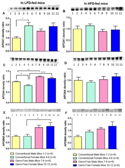 In the LFD group, the CV female mice had significantly higher APOA1 levels than the CV male mice. However, the difference disappeared after 4-week HFD feeding (Figure 4A,B). Additionally, no significant difference in APOA1 levels was found between male and female GF mice on LFD or HFD feeding (Figure 4A,B).