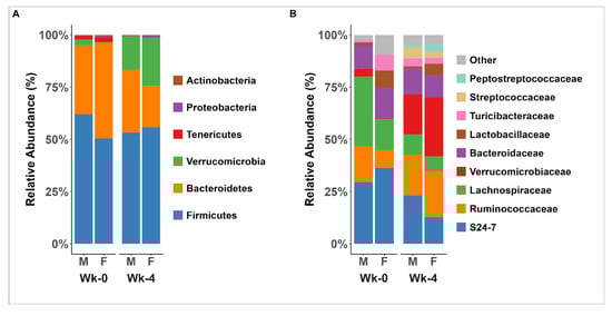 Gut microbiota was associated with sex and HFD at multiple taxa levels. Microbiota community structure at the phylum (A) and family levels (B), separated by sex and HFD feeding time (weeks). Data are shown as a relative proportion of the taxa identified. Taxa with a prevalence of >10% or with a maximum proportion of >0.2% were included. n = 6 mice per group.