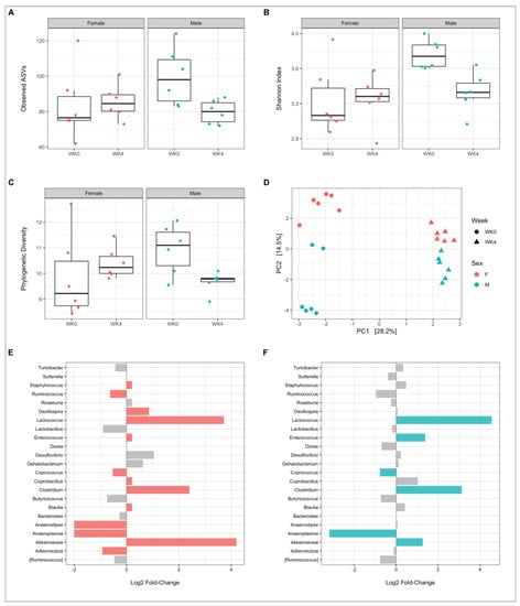Measures of alpha-diversity, including the number of observed amplicon sequence variants (ASVs) (100 ± 16 vs. 80 ± 7, p = 0.02), Shannon diversity (3.8 ± 0.2 vs. 3.3 ± 0.2, p = 0.004), and phylogenetic diversity (10.9 ± 1.0 vs. 9.7 ± 0.4, p = 0.03) were decreased in male mice at Week 4 when compared to Week 0 (Figure 6A–C). No statistically significant differences were observed for the change in alpha-diversity from Week 0 to Week 4 in female mice (Supplementary Table S1). The difference in the change in alpha-diversity for female versus male mice at Week 4 versus Week 0 was an increase in observed ASVs of 19.8 ± 8.2 (interaction p = 0.03), an increase in Shannon diversity of 0.4 ± 0.1 (interaction p = 0.01), and an increase in phylogenetic diversity of 1.3 ± 0.6 (interaction p = 0.04), which were due to corresponding decreases in males (Supplementary Table S1).