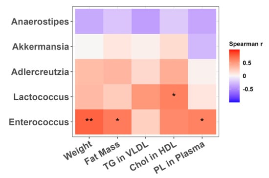 The relationship between microbiota composition and lipid parameters. * p < 0.05 and ** p < 0.01.