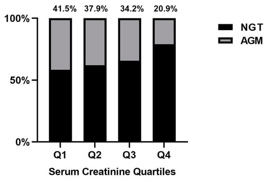 The prevalence of postpartum AGM according to first-trimester serum creatinine quartiles. Abbreviations: NGT stands for normal glucose tolerance; AGM stands for aberrant glucose metabolism.