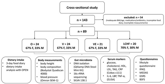 Study design. O—omnivorous; V—vegan; VE—vegetarian; LCHF—low-carbohydrate, high-fat; F—females; M—males; OPEN—Open Platform for Clinical Nutrition; HDL—high-density lipoprotein; LDL—low-density lipoprotein; TAG—triacylglycerol; CRP—C-reactive protein; IL-6—interleukin-6; LBP—lipopolysaccharide binding protein; TNF-α—tumor necrosis factor-α; IPAQ—International Physical Activity Questionnaire; MEDAS—Mediterranean Diet Adherence Score; GSRS—Gastrointestinal Symptoms Rating Scale; BSFS—Bristol Stool Form Scale.
