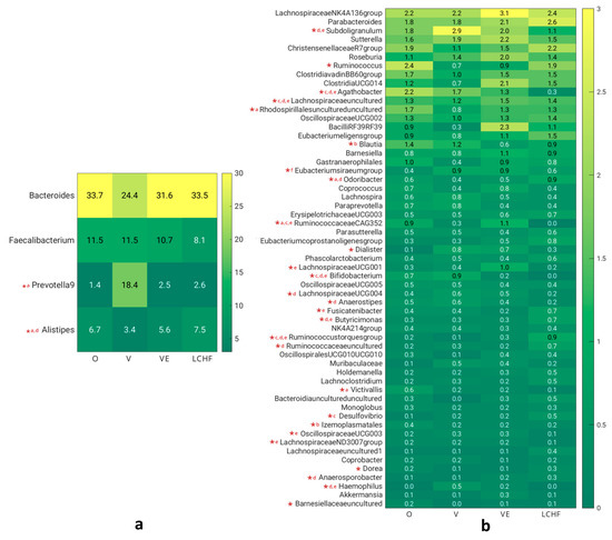 (a) Relative abundance of most represented gut microbial genera. (b) Relative abundance of less represented gut microbial genera. O—omnivorous; V—vegan; VE—vegetarian; LCHF—low-carbohydrate, high-fat; a—O–V; b—O–VE; c—O–LCHF; d—V–LCHF; e—VE–LCHF; f—V–VE (post hoc tests); *—statistically significant difference (ANOVA).